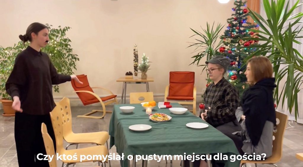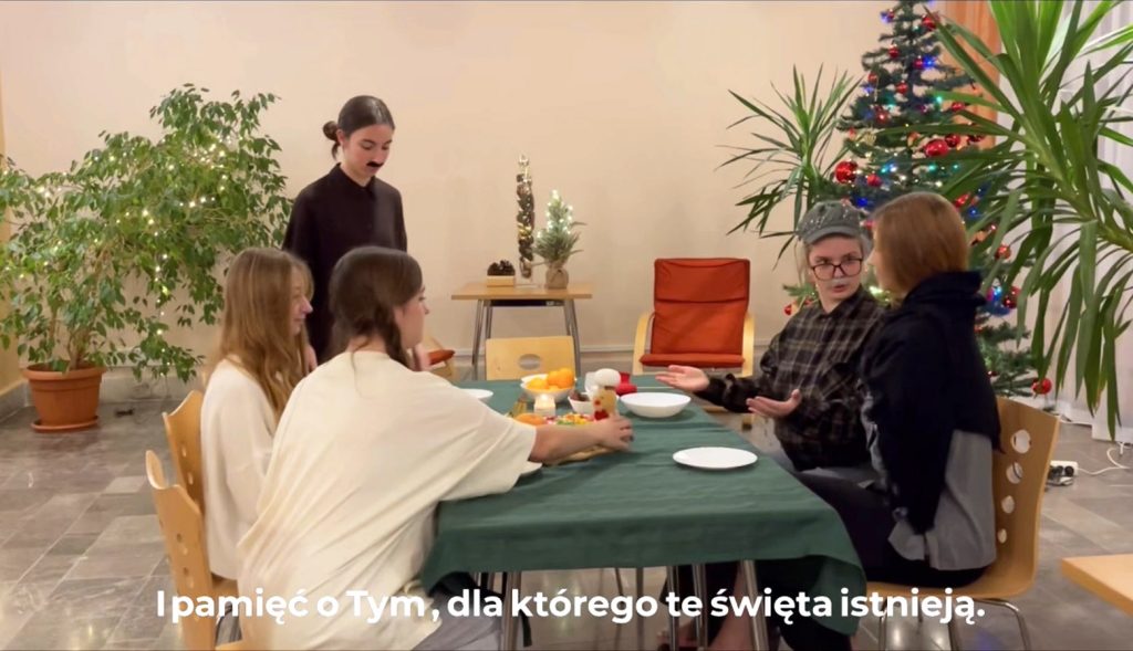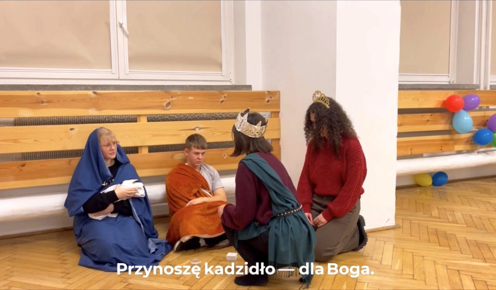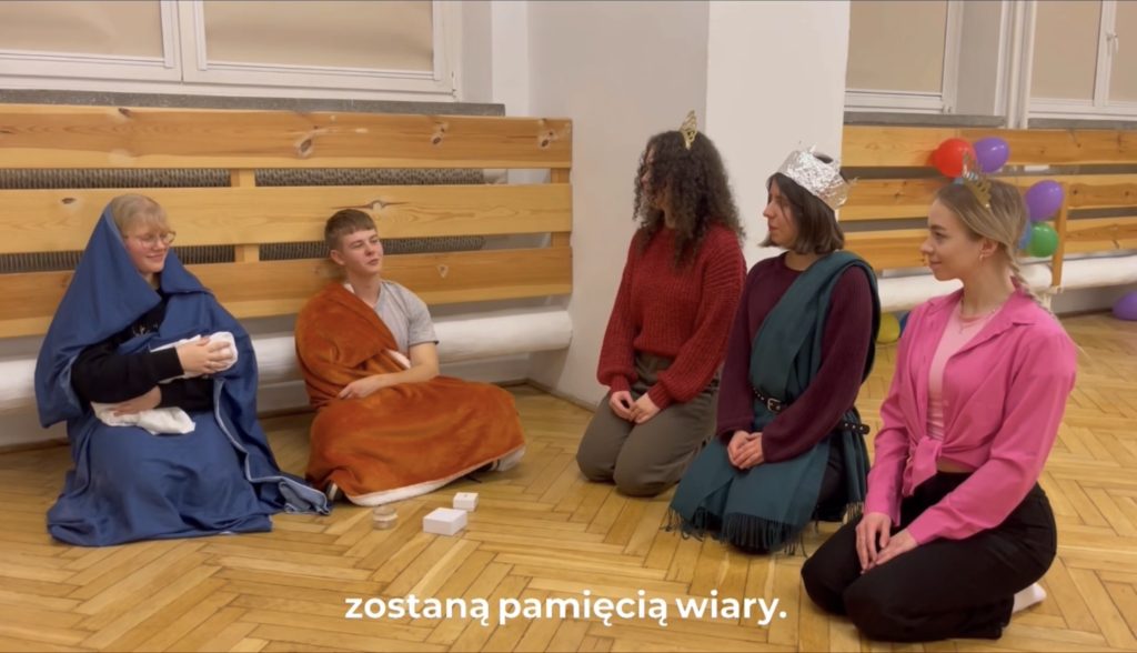 Historię narodzin Jezusa zna prawie każdy, a przenosząc ją na deski teatru, czy filmu dobrze mieć reżyserski pomysł. I Ci międzynarodowi studenci Katolickiego Uniwersytetu Lubelskiego mieszkający w akademiku Konstantyna go mieli – to współczesne architektonicznie miejsce akcji, w którym rozgrywają się biblijne wydarzenia. Sceną jest sala konferencyjna, korytarze, sala rekreacyjna. I trzeba powiedzieć, że owa teatralna oszczędność i skrót działa na widza – choćby patrząc na korytarzowy, ascetyczny żłóbek, gdzie nic nie ma, sianka nawet. Kostiumy aktorów również są proste – koce, narzuty, a czasem symboliczne korony królewskie z papieru. W spektaklu jest też narrator (z offu), który pomaga widzom przenieść się w przestrzeni i czasie, z akademika do biblijnego Betlejem. Jasełka mają też swoje finałowe przesłanie: miłość, którą przyniósł nam Jezus wciąż jest aktywna i potrafi w sposób cudowny jednoczyć ludzi.